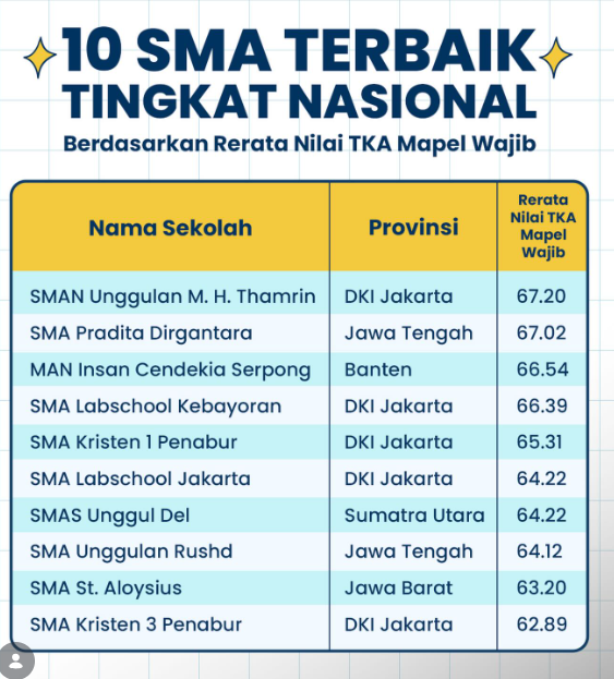 10 SMA Terbaik Tingkat Nasional Nilai TKA Tertinggi