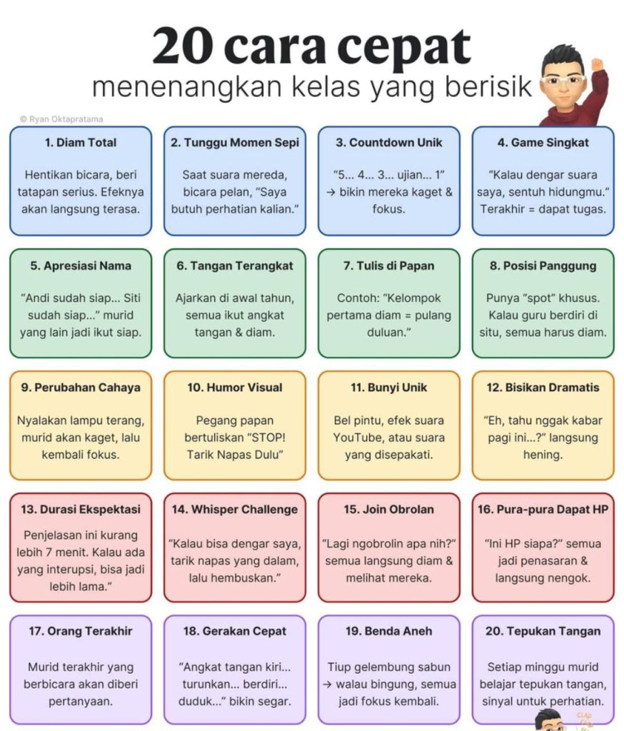 Guru tidak langsung menegur saat kelas ramai. Tunggu beberapa detik ketika suara mulai menurun, lalu bicara pelan, “Saya butuh perhatian kalian.” Suara pelan justru membuat murid lebih fokus.