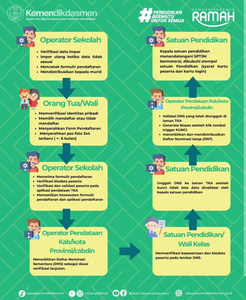 Pendaftaran Tes Kemampuan Akademik (TKA) dilakukan melalui beberapa tahapan yang melibatkan sekolah, orang tua/wali, dan dinas pendidikan. Mulai dari verifikasi data, kelengkapan berkas, hingga validasi berjenjang sesuai ketentuan.