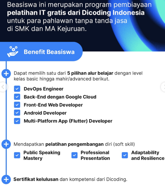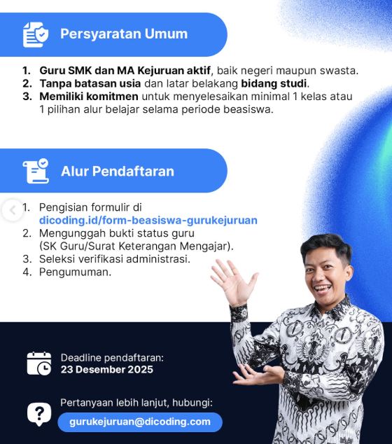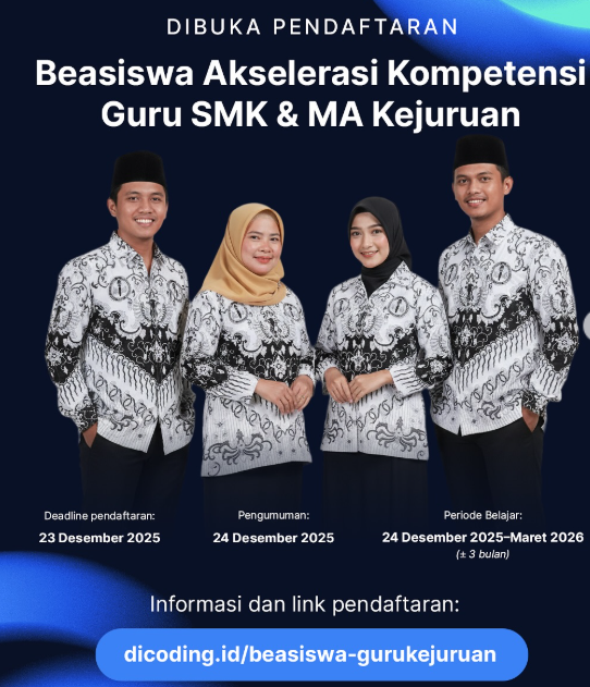 Dalam rangka memperkuat ekosistem Vokasi di Indonesia, Dicoding membuka pendaftaran program Beasiswa Akselerasi Kompetensi Guru SMK dan MA Kejuruan! 🎓