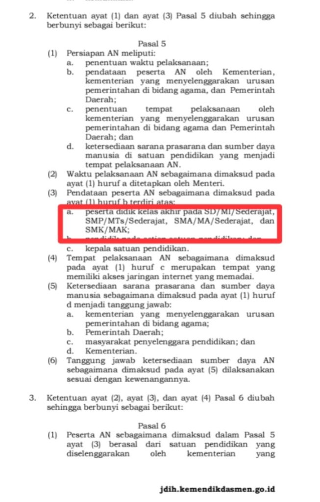 Secara awam intinya aturan ini menghapus ANBK dan Sulingjar Kelas V, VIII, XI. Kemudian digabung/dilaksanakan dengan kegiatan Tes Kompetensi Akademik (TKA) kelas VI, IX, XII.