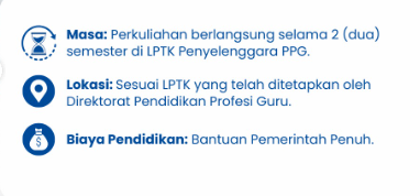 Kuliah berlangsung selama 2 semester di LPTK penyelenggara PPG yang telah ditetapkan oleh Direktorat Pendidikan Profesi Guru.