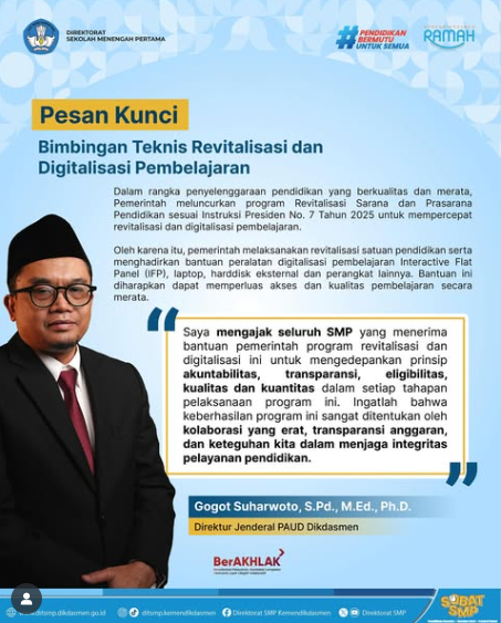 Dalam kegiatan Bimtek Revitalisasi dan Digitalisasi Pembelajaran, pesan beliau menjadi pengingat penting untuk terus bersinergi, berinovasi, dan menghadirkan pendidikan yang relevan bagi generasi masa depan.