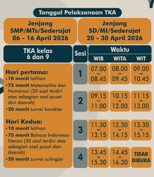 Tags: beritapendidikan terkiniCatat jadwal lengkap pelaksanaan TKA untuk jenjang SD/MI/Sederajat dan SMP/MTs/Sederajatinfo pendidikan terkinijadwal TKA SDpelaksanaan TKATKA SMP