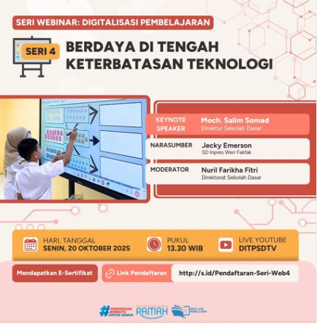 #SahabatSekolahDasar mari bergabung dalam webinar ini untuk mendapatkan informasi mengenai strategi dan praktik baik digitalisasi pembelajaran yang relevan untuk diterapkan di lingkungan sekolah dasar.