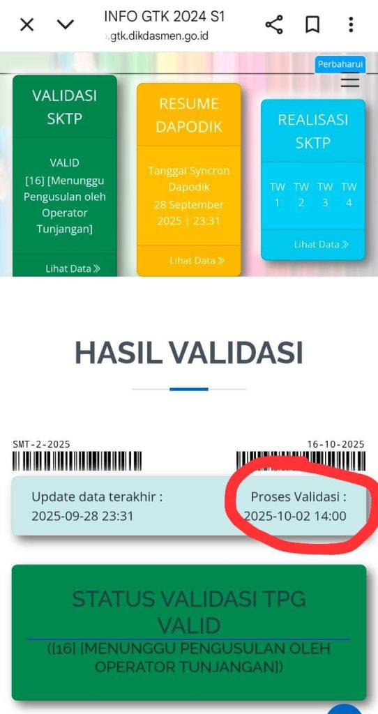 Silahkan Cek InfoGTKProses Validasi data Terbaru per 2 Oktober 2025 Link INFO GTK :https://info.gtk.dikdasmen.go.id/ Mudah mudahan yang tadinya Merah/Tidak Valid berubah menjadi Hijau / Valid.