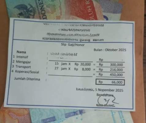 Seorang guru honorer mencurahkan isi hatinya. Di unggahannya, ia bercerita jika gaji bulan November ini hanya bisa untuk membeli bensin satu minggu. Ia mendapat gaji dengan total Rp516.000. Namun, ada potongan untuk dana koperasi/sosial sebesar Rp450.000, sehingga sisa gaji yang diterima hanya Rp66.000. Meskipun begitu, ia tetap berangkat mengajar karena senyum para murid menjadi semangatnya.