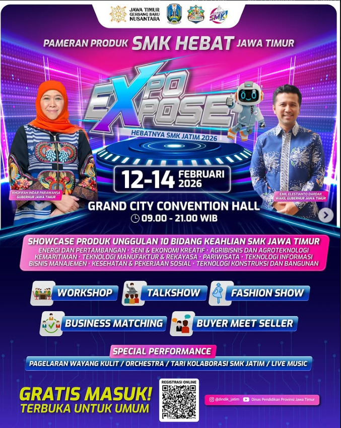 EXPOSE SMK HEBAT JATIM 2026 hadir menampilkan karya terbaik siswa SMK dari 10 bidang keahlian, mulai dari teknologi, kreatif, manufaktur, hingga agribisnis. Bukan hanya pameran, pengunjung juga bisa ikut workshop, talkshow, fashion show, business matching, buyer meet seller, hingga menikmati special performance seni dan budaya.