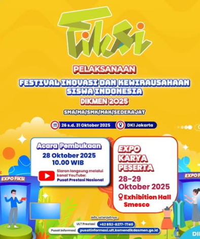 Festival Inovasi dan Kewirausahaan Siswa Indonesia (FIKSI) Tingkat Nasional 2025 diselenggarakan pada 26 s.d. 31 Oktober 2025, yuk mari semarakkan Sob! ✨