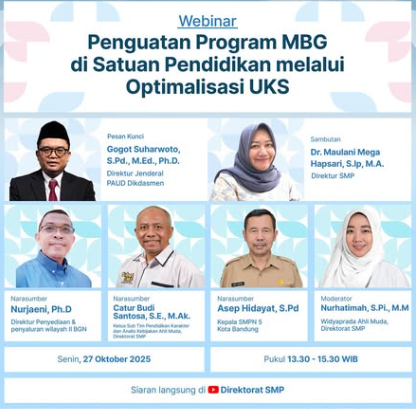 Untuk menyukseskan pelaksanaannya, Direktorat SMP menyelenggarakan webinar “Penguatan Program MBG di Satuan Pendidikan melalui Optimalisasi UKS”, akan dilaksanakan: