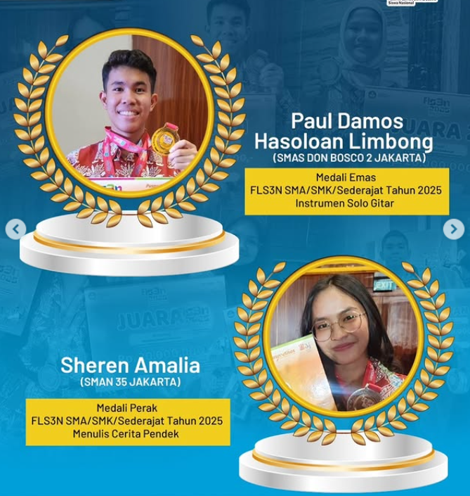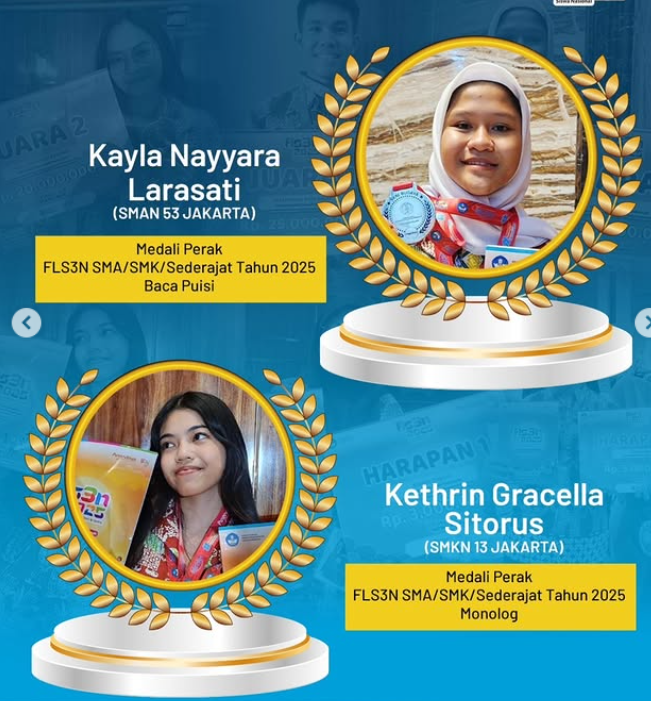 Selamat kepada Kontingen DKI Jakarta berhasil membawa 1 Emas 3 Perak, Harapan Satu 1 dan Harapan Dua 1 dalam dengan total 4 medali dalam ajang Festival Lomba Seni dan Sastra Siswa Nasional (FLS3N ) SMA/SMK/Sederajat Tahun 2025.
