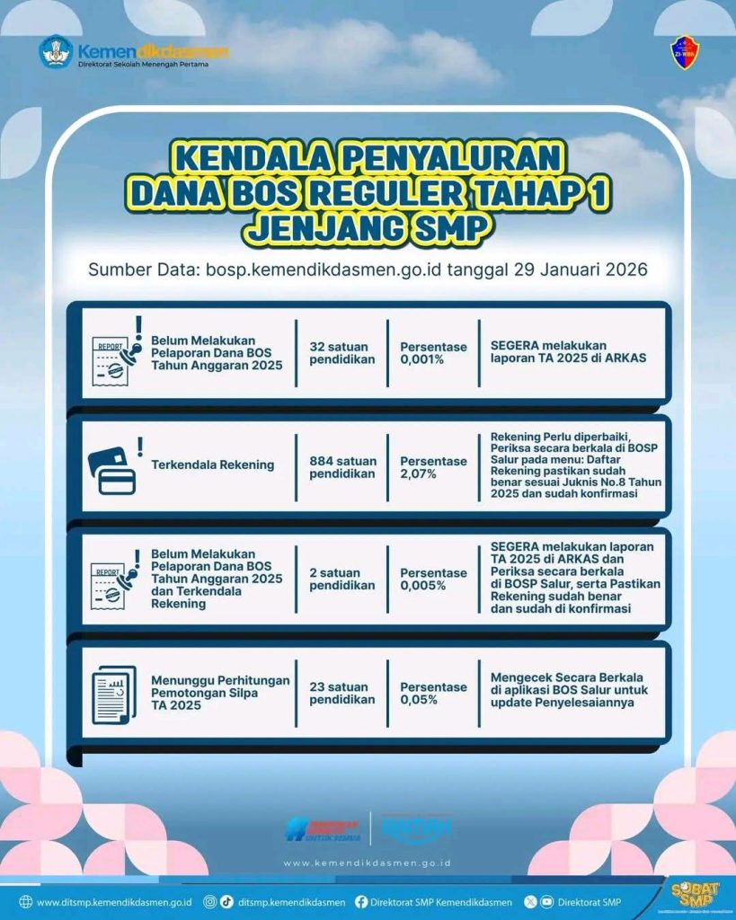 Penyaluran Dana BOS Reguler Tahap 1 jenjang SMP masih menghadapi beberapa kendala.