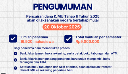 Pencairan dana KJMU Tahap II Tahun 2025 akan dilaksanakan secara bertahap mulai 20 Oktober 2025.