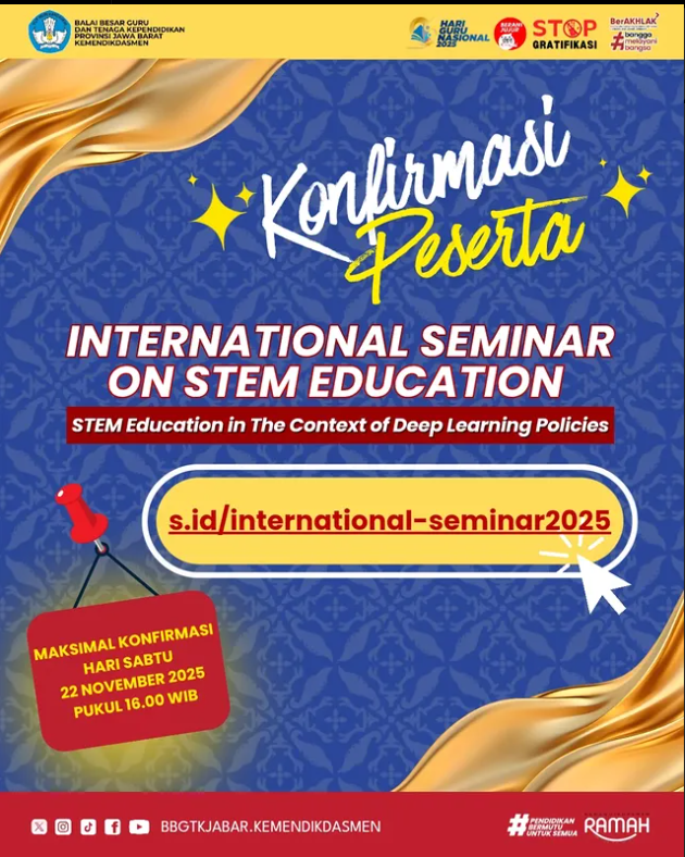 BBGTK Jawa Barat mengundang seluruh calon peserta International Seminar on STEM Education untuk melakukan konfirmasi kehadiran. Informasi lengkap mengenai daftar nama calon peserta, konfirmasi kehadiran, serta surat undangan dapat diakses melalui tautan berikut: