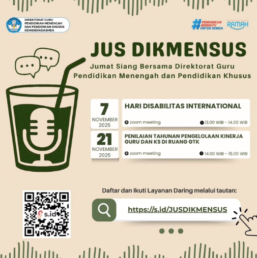 Ada konsultasi daring JUS DIKMENSUS (Jumat Siang Bersama Direktorat Guru Pendidikan Menengah dan Pendidikan Khusus).