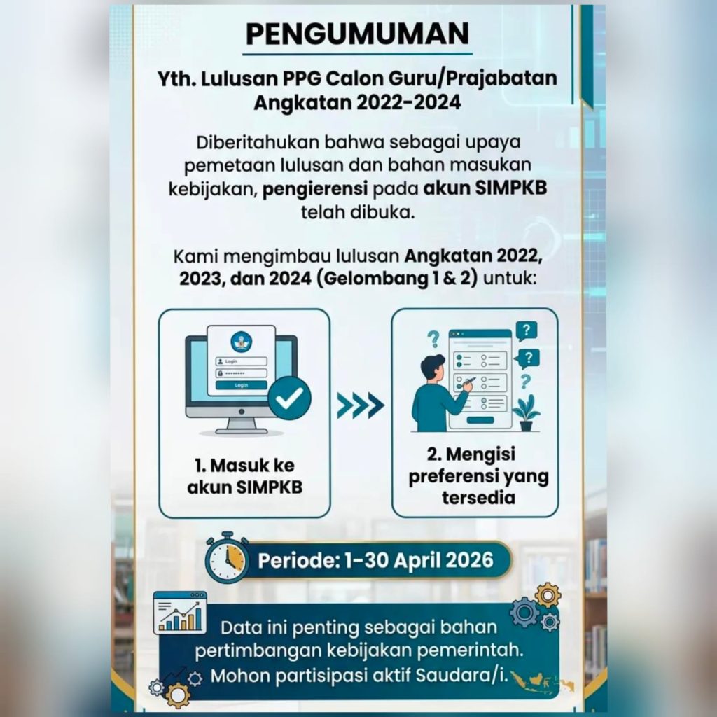 Pengisian preferensi SIMPKB ditujukan kepada lulusan PPG Calon Guru/Prajabatan angkatan 2022, 2023, dan 2024 (Gelombang 1 & 2). Kegiatan ini bertujuan untuk melakukan pemetaan lulusan serta menjadi bahan pertimbangan dalam penyusunan kebijakan pemerintah ke depan.