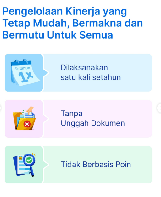 Prosesnya Tetap mudah, bermakna, dan bermutu untuk semua. Dilaksanakan satu kali dalam setahun, tanpa unggah dokumen, dengan fokus pada peningkatan praktik kinerja yang berdampak.