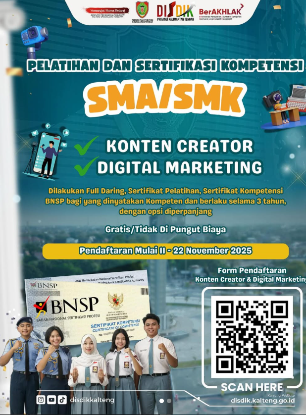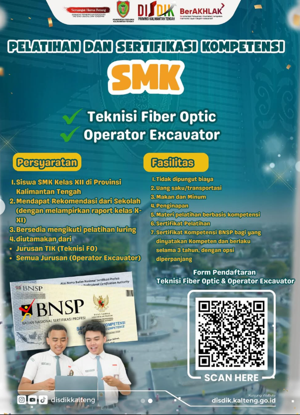 Sebagai upaya untuk peningkatan mutul dan kualitas SDM Pemprov Kalteng melalui Dinas Pendidikan mengajak untuk mengikuti Pelatihan dan Sertifikasi bidang keahlian sebagai modal awal untuk siap masuk ke dunia kerja atau melanjutkan ke jenjang yang lebih tinggi
