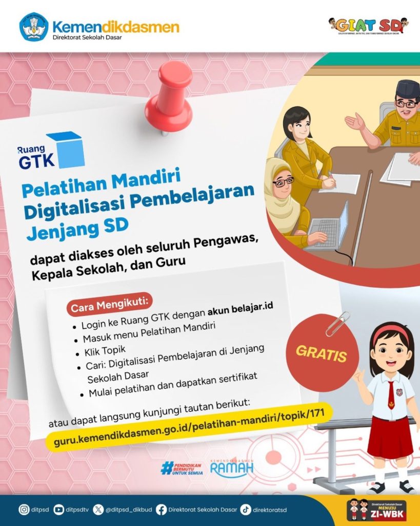 Sebagai upaya membangun ekosistem pembelajaran berbasis digital, Pelatihan Mandiri dengan topik Digitalisasi Pembelajaran di Jenjang SD dirancang untuk memberikan inspirasi agar proses belajar menjadi lebih interaktif, inovatif, dan bermakna. Untuk tata cara mengikutinya, Sahabat Sekolah Dasar dapat melihat informasi lengkapnya pada unggahan ini.