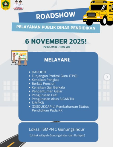 Sesuai dengan Amanat Bapak Bupati Bogor, @rudysusmanto Untuk meningkatkan akselerasi dan efektifitas pelayanan publik pada sektor pendidikan. Bersama ini Dinas Pendidikan Kabupaten Bogor mengadakan program Roadshow Pelayanan Publik bagi masyarakat, tenaga pendidik dan kependidikan