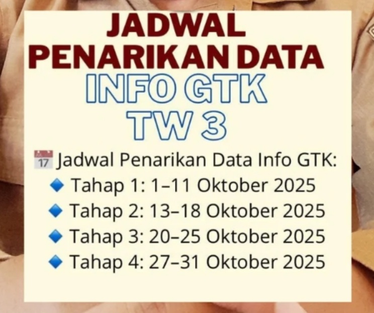 Berdasarkan jadwal resmi, penarikan data Info GTK dibagi menjadi beberapa tahap: tahap pertama berlangsung sejak 1 hingga 11 Oktober 2025, lalu dilanjutkan tahap kedua pada 13–18 Oktober 2025, dan tahap-tahap berikutnya.