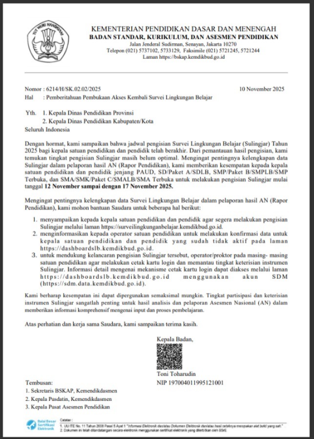 Berikut disampaikan SE kepala BSKAP berkaitan pembukaan kembali pengisian sulingjar AN 2025, mohon satuan pendidikan untuk mengoptimalkan pengisiannya sesuai waktu yang tersedia. Selengkapnya silahkan baca atau unduh di : 👇🏻https://drive.google.com/file/d/1mijS5ZeSDtSn8GydWseqJk7jBxC6G89q/view?usp=sharing Terima kasih.