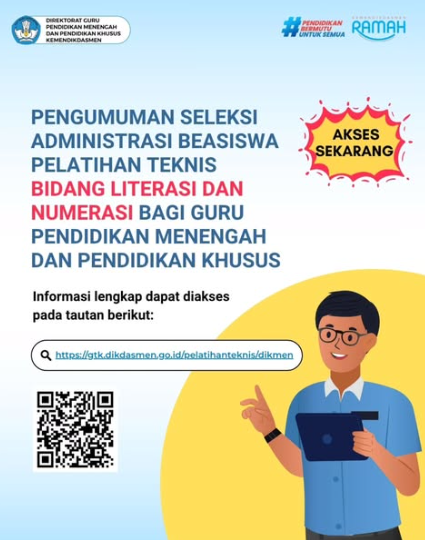 Telah terbit Pengumuman Seleksi Administrasi Beasiswa Pelatihan Teknis bidang Literasi dan Numerasi bagi Guru Pendidikan Menengah dan Pendidikan Khusus.