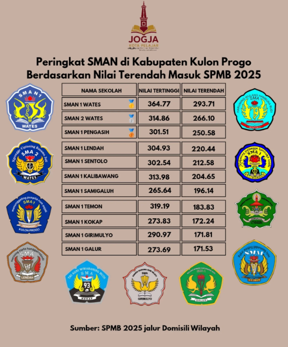 Peringkat SMAN di Kabupaten Kulon Progo berdasarkan Nilai Terendah Masuk SPMB 2025. Data ini menunjukkan persaingan ketat antar sekolah favorit di Kulon Progo