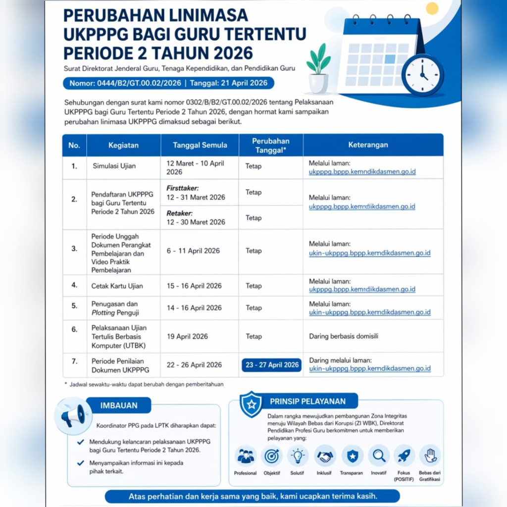 Disampaikan adanya perubahan linimasa pelaksanaan UKPPPG bagi Guru Tertentu Periode 2 Tahun 2026 sebagai berikut: