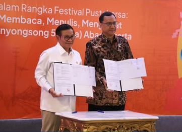 Gubernur Provinsi DKI Jakarta Bapak Pramono Anung didampingi oleh Kepala Dinas Pendidikan Provinsi DKI Jakarta Ibu Nahdiana beserta Kepala Dinas Perpustakaan dan Kearsipan Prov DKI Jakarta Bapak Nasruddin Djoko Surjono menghadiri Festival Pustakarsa yang berlangsung di Gelari Emiria Soenassa, TIM Jakarta Pusat.