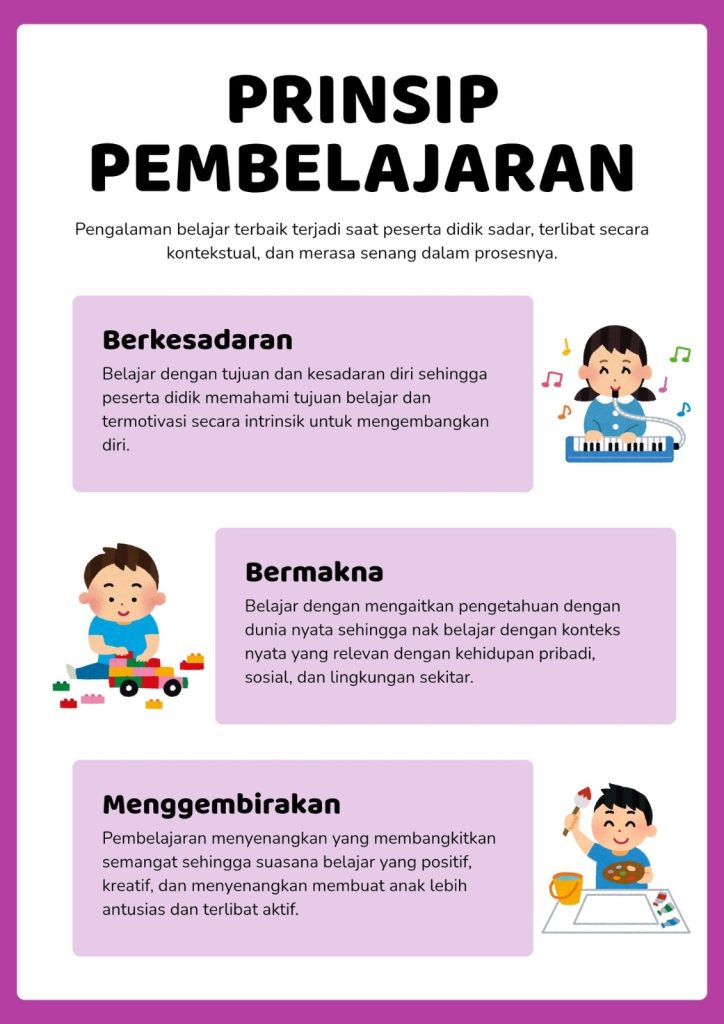 Pengalaman belajar yang paling efektif dan berkesan tidak hanya terjadi di permukaan, tetapi merasuk ke dalam diri pembelajar. Prinsip-prinsip ini berfokus pada pembangunan pemahaman yang utuh, keterlibatan yang tulus, dan motivasi intrinsik. Tiga pilar utama dari Pembelajaran Mendalam adalah Berkesadaran, Bermakna, dan Menggembirakan.