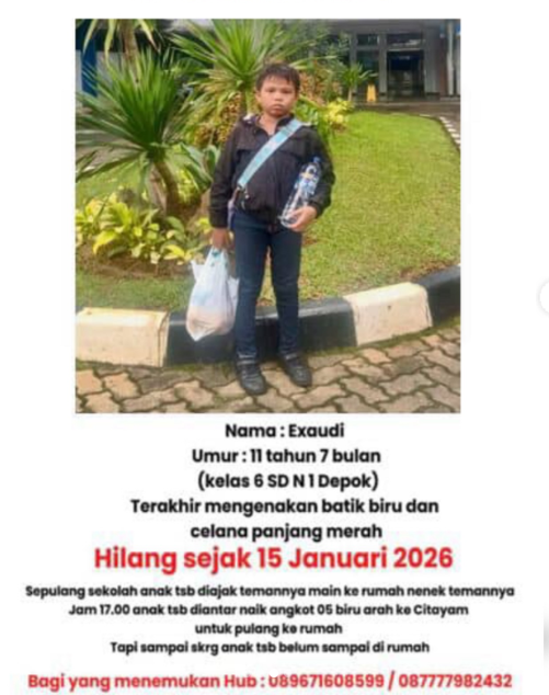 Seorang anak bernama Exaudi (11), siswa kelas 6 SDN 1 Depok, dilaporkan hilang sejak Rabu, 15 Januari 2026. Hingga kini, pihak keluarga masih berupaya mencari keberadaan korban dan berharap bantuan dari masyarakat.