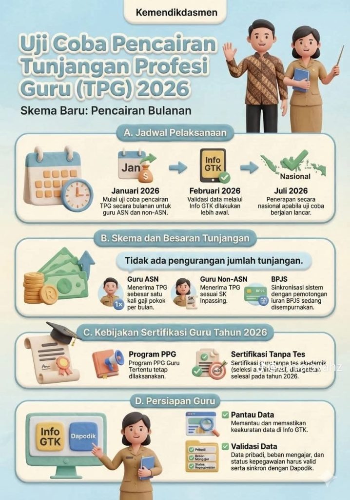 Mulai 2026, TPG direncanakan tidak lagi dicairkan per tahap, tetapi dibayarkan setiap bulan, dengan catatan uji coba berjalan lancar.