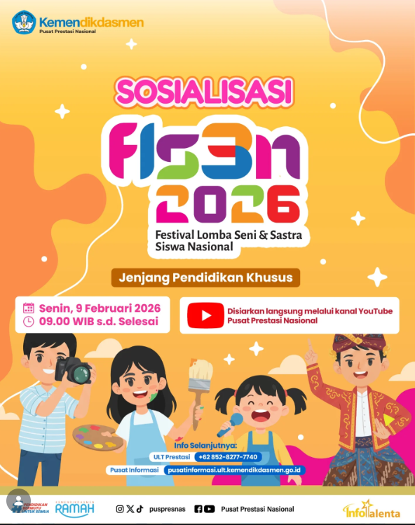 Saksikan “Sosialisasi Festival Lomba Seni dan Sastra Siswa Nasional (FLS3N) Jenjang Pendidikan Khusus (Diksus) Tahun 2026”, disiarkan langsung melalui kanal YouTube Pusat Prestasi Nasional. 📡