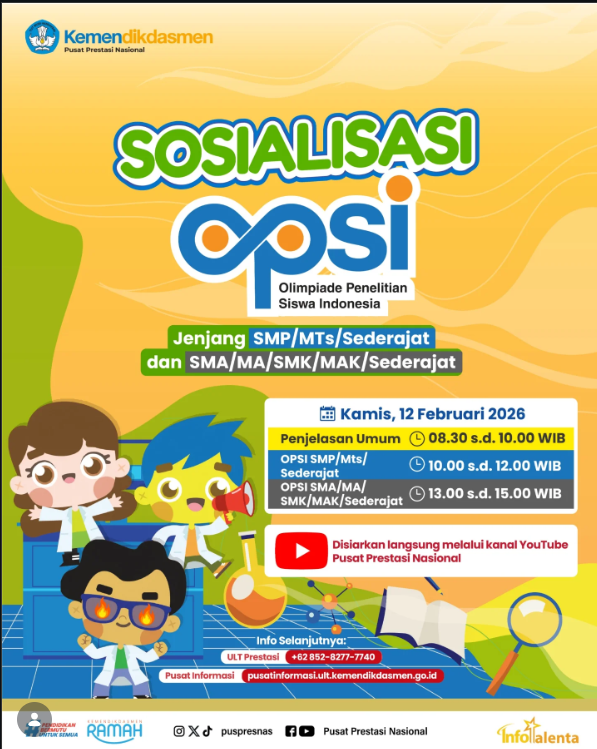 Saksikan “Sosialisasi Olimpiade Penelitian Siswa Indonesia (OPSI) 2026” pada Kamis, 12 Februari 2026 Pukul 08.30 WIB, disiarkan secara langsung melalui kanal YouTube Pusat Prestasi Nasional. 📡