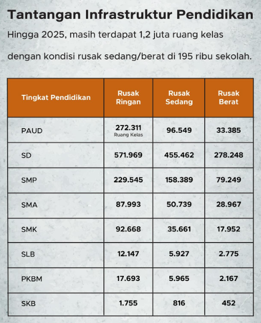 Jumlah ruang rusak berat di SD saja (278 ribu) sudah lebih besar dari total seluruh ruang rusak sedang di jenjang SMA, menunjukkan beban perbaikan terbesar berada di pendidikan dasar.