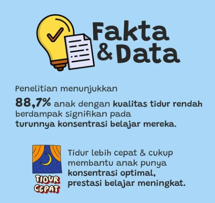 Penelitian menunjukkan bahwa 88,7% anak dengan kualitas tidur yang buruk mengalami penurunan konsentrasi belajar. Kurangnya waktu tidur tidak hanya membuat anak mudah lelah, tetapi juga menurunkan kemampuan fokus dan daya ingat.