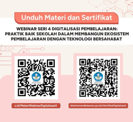 Berikut link untuk mengunduh materi dan sertifikat Webinar Seri 4 Digitalisasi Pembelajaran: Praktik Baik Sekolah dalam Membangun Ekosistem Pembelajaran dengan Teknologi Bersahabat yang diselenggarakan pada Senin (20/10)