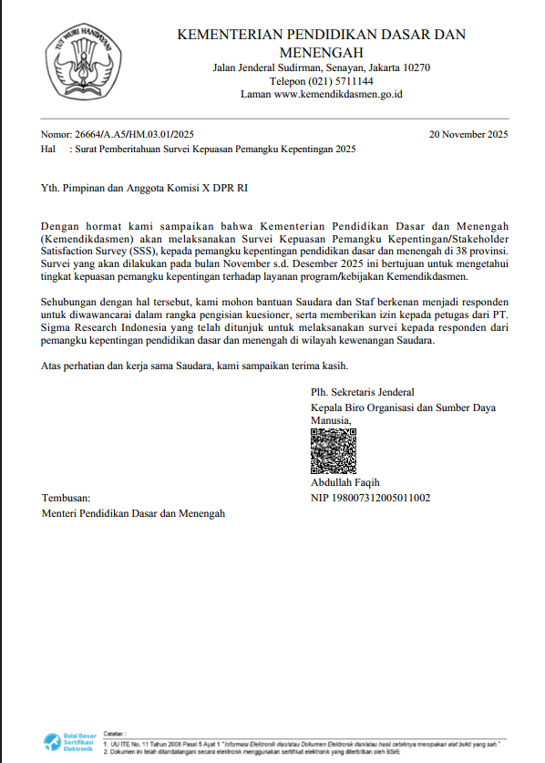 Kementerian Pendidikan Dasar dan Menengah (Kemendikdasmen) akan melaksanakan Survei Kepuasan Pemangku Kepentingan/Stakeholder Satisfaction Survey (SSS), kepada pemangku kepentingan pendidikan dasar dan menengah di 38 provinsi. Survei yang akan dilakukan pada bulan November s.d. Desember 2025 ini bertujuan untuk mengetahui tingkat kepuasan pemangku kepentingan terhadap layanan program/kebijakan Kemendikdasmen.