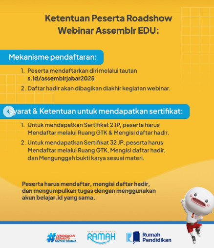 Kemendikdasmen berkolaborasi dengan Dinas Provinsi Jawa Barat dan Balai Besar Guru dan Tenaga Kependidikan Provinsi Jawa Barat menyelenggarakan Roadshow Webinar Assemblr EDU dengan judul: Pelatihan Pembuatan Flip Card Interaktif dengan Assemblr EDU.
