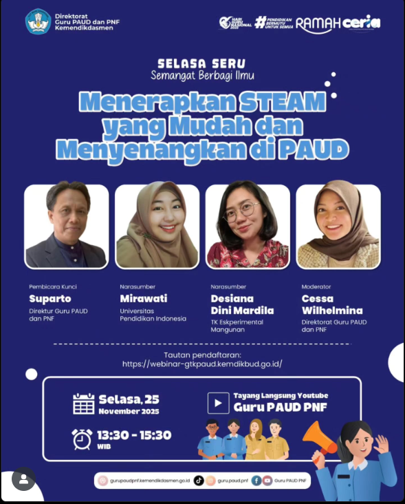 Nah, tepat di Hari Guru Nasional 2025 Program Selasa Seru akan hadir dengan tema yang sangat menarik “Menerapkan STEAM yang Mudah dan Menyenangkan di PAUD”.
