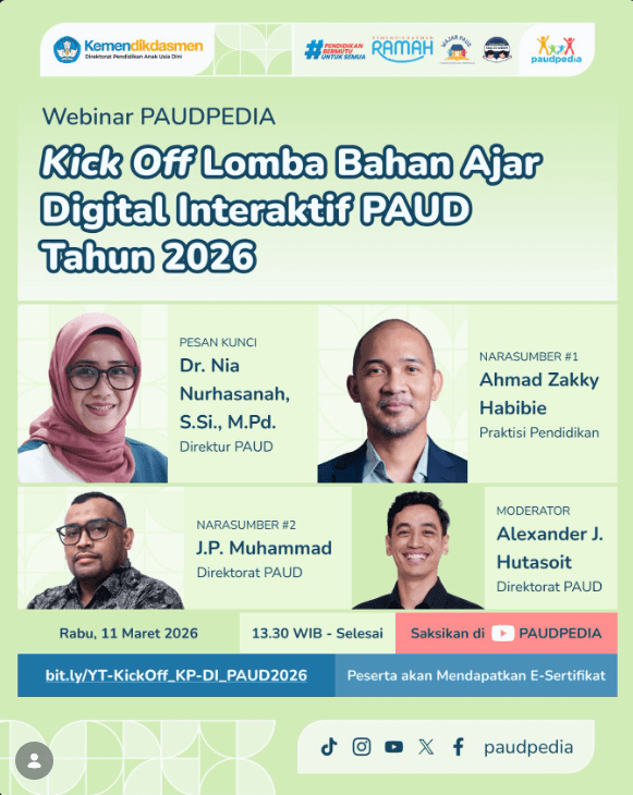 Merujuk perihal tersebut, Direktorat PAUD akan menyelenggarakan Webinar βKick Off Lomba Bahan Ajar Digital Interaktif PAUD Tahun 2026β pada: