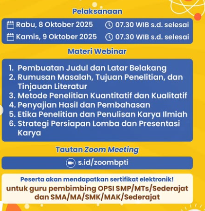 Yuk, ikuti webinar pengembangan Pemandu Talenta OPSI untuk mendapatkan wawasan mendalam tentang dunia riset bagi guru pembimbing OPSI SMP/MTs dan SMA/MA/SMK/MAK.