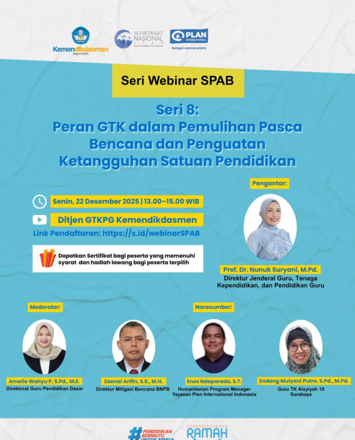 Rangkaian Webinar SPAB akhirnya sampai di seri penutup. Di tengah bencana yang masih terjadi di berbagai wilayah Indonesia, pemulihan pendidikan menjadi tantangan sekaligus tanggung jawab bersama. Melalui Webinar SPAB Seri 8: โPeran GTK dalam Pemulihan Pasca Bencana dan Penguatan Ketangguhan Satuan Pendidikanโ, kita akan belajar bagaimana guru dan tenaga kependidikan berperan strategis memastikan pembelajaran tetap berlanjut, sekolah kembali pulih, dan komunitas pendidikan bangkit lebih kuat. ๐ช๐ซ๐ฑ